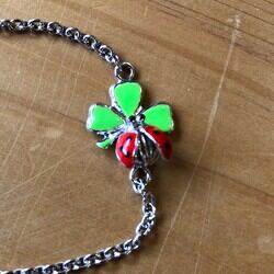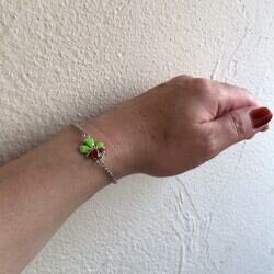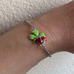 貴金属製造のミルコ・トミーによるイタリア製のシルバー925のブレスレットです。 今にも飛び立ちそうなてんとう虫とクローバーのチャームがポイントです。一点一点手作業でエナメルを用いて色付けしています。 【仕様】 本体全長約15.5cm、アジャスター約2cm、チャーム約1.5cm、重さ=5g、イタリア製 【ご注意】 ハンドメイドの商品のため、一点一点サイズや重さに多少差異がございます。ご了承ください。